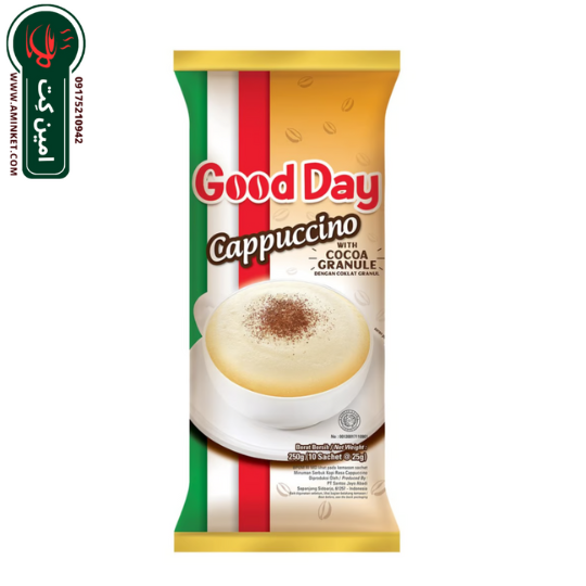 کاپوچینو گوددی good day با گرانول کاکائو یه انتخاب فوقالعاده برای اوناییه که عاشق طعم ملایم و خامهای کاپوچینو هستن! ترکیب قهوه باکیفیت، شیر و کاکائو باعث میشه با هر جرعه حس یه کاپوچینوی حرفهای رو تجربه کنی. هر بسته شامل 10 ساشه 25 گرمی هست که برای 10 فنجون کاپوچینو خوشعطر و خوشطعم کافیه! کاپوچینو گوددی طرح جدیدی از کاپوچینو گوددی میباشد که در بسته بندی های جدید و بسیار جذاب از سمت شرکت گوددی اندونزی ارائه شده است.