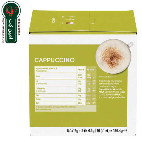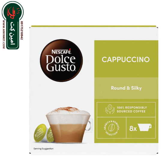 کپسول دولچه گوستو مدل کاپوچینو Cappuccino شامل یک باکس 16 عددی با بهترین عطر و طعم از شرکت دولچه گوستو ( شرکت نسکافه ) میباشد. در هر بسته کپسول کاپوچینو، 8 عدد کپسول کپسول قهوه و 8 عدد کپسول شیر است. این عطر و طعم برای کسانی که مایل به نوشیدن قهوه تلخ نیستند و ترجیح میدهند یک قهوه با طعم ملایم داشته باشند توصیه میشود. میزان غلظت و کافئین این کپسول متوسط بوده و دارای تلخی متوسط و فوم بالا میباشد. کپسول دولچه گوستو مدل کاپوچینو Cappuccino را از فروشگاه امین کِت با ضمانت اصل بودن کالا دریافت نمایید.